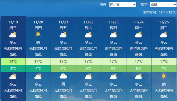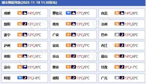中国天气网讯 今天(11月19日)白天,四川盆地部分地区气温回升,暖意回归。预计,今天夜间到后天,四川盆地以多云天气为主,白天最高气温还将有所回升,但昼夜温差较大金牛在线,一早一晚仍需注意保暖。同时,攀西地区和川西高原多雨雪天气出没,公众出行请留意交通安全。