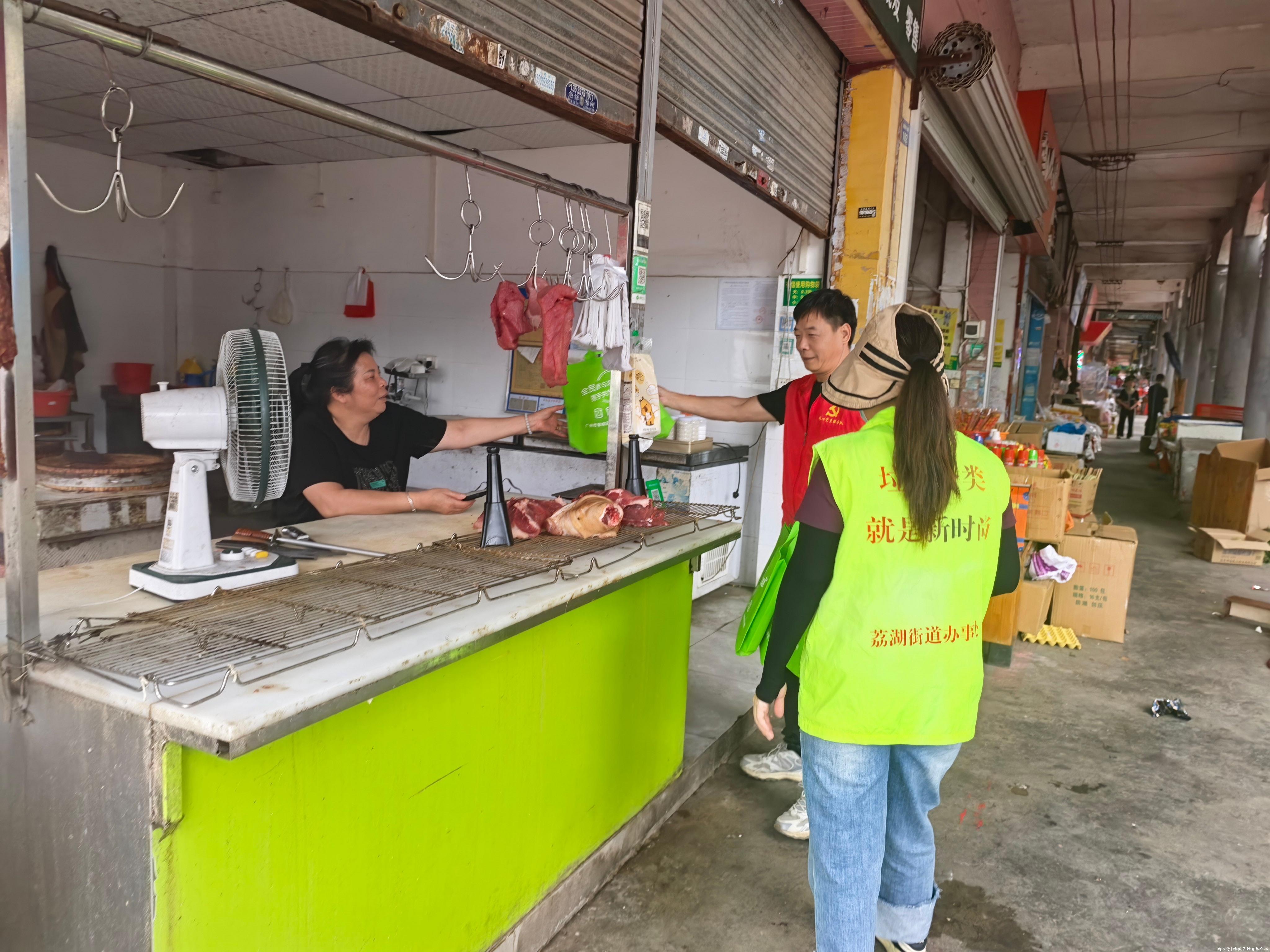 此次行动,荔湖街精准发力,让垃圾分类走进菜市场落地见效。活动现场,街市政环卫组工作人员向商铺和市民宣传垃圾分类知识,现场派发宣传单张和可重复使用的环保袋。工作人员还向商户倡导规范投放垃圾,引导商户不随意丢弃垃圾于地面、摊位周边,及时将挑剩的菜叶、烂果等厨余垃圾准确投入厨余垃圾桶;同时向市民宣传绿色购物理念,倡导群众在菜市场购物时自行携带环保袋,主动拒绝使用一次性塑料袋,共同营造干净整洁、绿色低碳的市场环境。